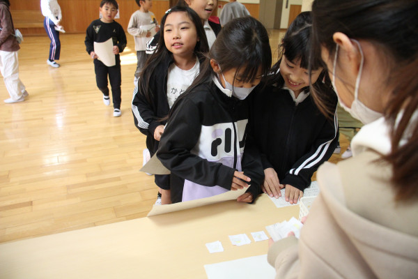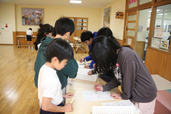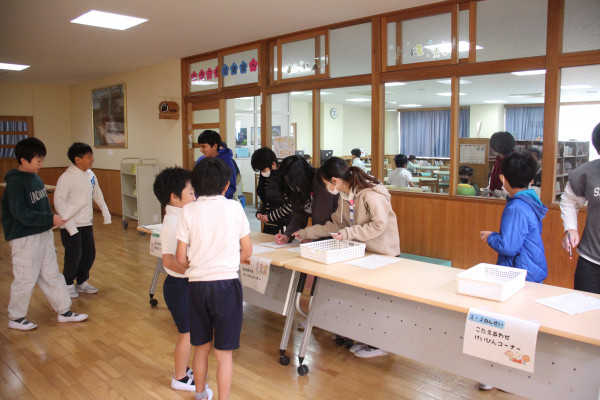 11月18日から20日の休み時間に、図書クイズを行うキャンペーンがありました。図書委員会が考えた図書に関するクイズに答えると、日の出小キャラクター「ひのこ」のシールがもらえます。たくさんの子が参加し、大盛況でした。