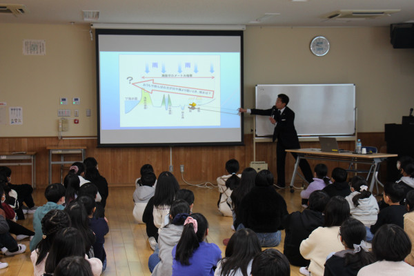 1/22(木)に弥富市長 安藤正明様をお迎えし、出前授業を行っていただきました。弥富市は海抜ゼロメートル地帯です。低い地域である弥富市に大雨が降っても困らないのは、いくつもの排水機場があり、水の調整ができているからです。そんな大切な役割を果たす排水機場にある機械の大きさや仕組みなどについて、分かりやすく話をしていただきました。